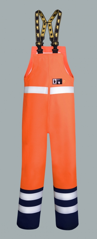 The bibpants are made of high quality fabric coated PU/PVC and it's waterproof and antistatic and flame resistant fabric – Plavitex Multi (thickness 0,65mm, weight 530 g/m²) in fluorescent orange and navy blue colours. The product has also reflective tapes; The seams are welded with high frequency current; The bibpants can be used for welding or grinding in the open area, in adverse weather conditions, where there's a high level of wetness. The bibpants protect against rain and wind and enables the user to work in territories endangered by explosions and in high-risk zones. Extra double “high frequency welded” seams ensure reliability under the most extreme conditions. The product conforms with the EN 340, EN 343+A1, EN 1149-5, EN ISO 14116 standards.