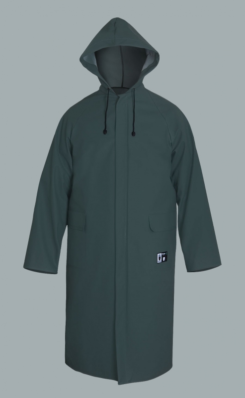 Hergestellt aus dem Polyester Gewirk mit Polyvinylchlorid beschichtet. Der Mantel wird mit Metalldruckknöpfen zugeknöpft, die mit einem Plissee bedeckt sind, um den Arbeiter vor Strom zu schützen .Der schweranzündbare Stoff erlaubt Schweiβen und Schleifen im Freien und bei schlechten Wetterbedingungen. Der Mantel vorbeugt dem Nasswerden der unteren Beinparteien. Die Kapuze sichert den Kopf vor Regen und Wind. Der Mantel schützt den Arbeiter vor Regen und Wind und ermöglicht die Arbeit an Gasausbruch gefährdeten Stellen und mit hohem Risiko z.B.: wo es Kontakt mit flüchtigem Gas oder Methandünsten gibt. Das Produkt erfüllt die europäischen Normen: EN 340, EN 343, EN 1149-5.