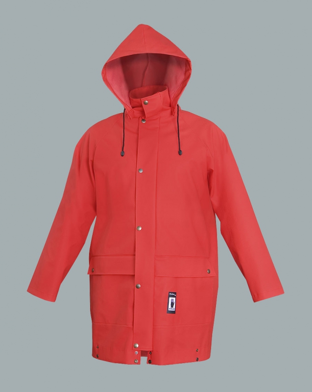Hergestellt aus Polyestergewirk mit PVC-Beschichtung. Das Produkt wird bei Arbeiten unter schwierigen und ungünstigen Witterungsbedingungen eingesetzt. Die Jacke ist mit einer Wasser-/Regenrinne ausgestattet, die einen freien Wasserablauf ermöglicht und ein Durchnässen des hinteren Hosenteils verhindert. Das Produkt besitzt neben der professionell geschnittenen Kapuze auch eine Verschlussabdeckung (Plissee) und bietet somit einen noch besseren Schutz vor Regen und Wind. Auf Grund der beidseitigen Hochfrequenzschweißung des Produktes kann es unter extrem ungünstigen Bedingungen eingesetzt werden.
