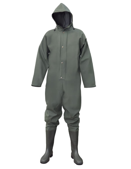 Der einteilige Overall wurde mit Hilfe der Technik des beidseitigen Presschweißens geferigt, was im wesentlichen die Wiederstandsfähigkeit der Nähte erhöht. Die eingeschweißten Gummistiefel bieten Dauerschutz gegen das Eindringen von Wasser.