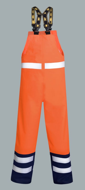 The bibpants are made of high quality fabric coated PU/PVC and it's waterproof and antistatic and flame resistant fabric – Plavitex Multi (thickness 0,65mm, weight 530 g/m²) in fluorescent orange and navy blue colours. The product has also reflective tapes; The seams are welded with high frequency current; The bibpants can be used for welding or grinding in the open area, in adverse weather conditions, where there's a high level of wetness. The bibpants protect against rain and wind and enables the user to work in territories endangered by explosions and in high-risk zones. Extra double “high frequency welded” seams ensure reliability under the most extreme conditions. The product conforms with the EN 340, EN 343+A1, EN 1149-5, EN ISO 14116 standards.