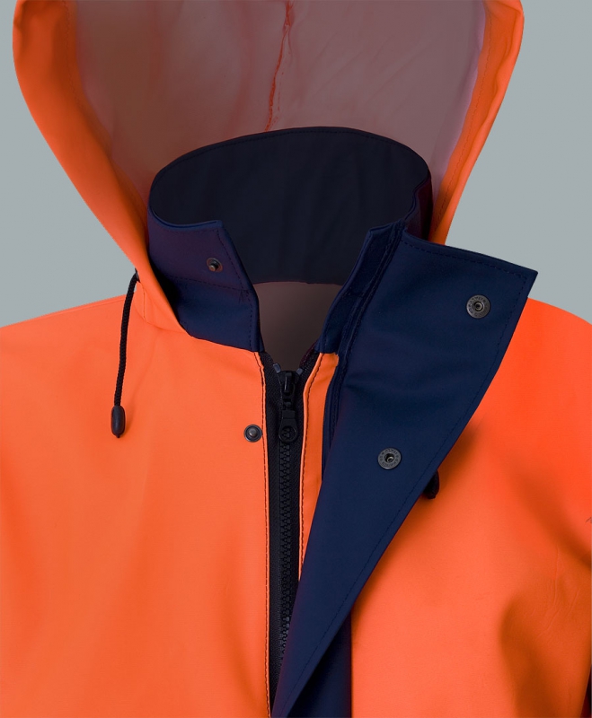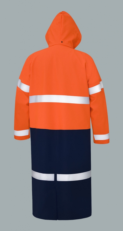 Der Mantel wird aus dem Polyester Gewirk hergestellt mit Polyvinylchlorid beschichtet, Der Mantel wird mit Metalldruckknöpfen zugeknöpft, die mit einem Plissee bedeckt sind, um den Arbeiter vor Strom zu schützen. Der Mantel schützt den Arbeiter vor Nasswerden im Beinbereich. Wenn man dazu Gummistiefel trägt ist die Wasserschutzhose überflüssig. Bei schlechtem Wetter ist es möglich die Kapuze anzuziehen. Der Mantel schützt den Arbeiter vor Regen und Wind und ermöglicht die Arbeit an Gasausbruch gefährdeten Stellen und mit hohem Risiko z.B.: wo es Kontakt mit flüchtigem Gas oder Methandünsten gibt. Das Produkt erfüllt die europäischen Normen: EN 340, EN 343, EN 1149-5 und EN ISO 14116.