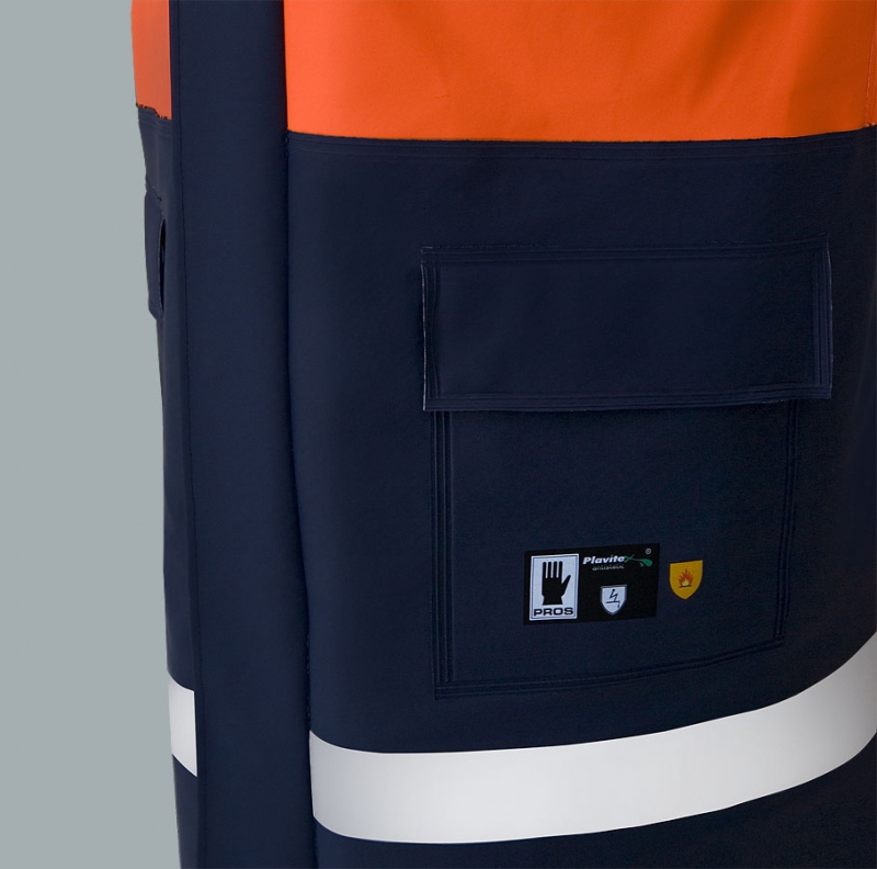 Der Mantel wird aus dem Polyester Gewirk hergestellt mit Polyvinylchlorid beschichtet, Der Mantel wird mit Metalldruckknöpfen zugeknöpft, die mit einem Plissee bedeckt sind, um den Arbeiter vor Strom zu schützen. Der Mantel schützt den Arbeiter vor Nasswerden im Beinbereich. Wenn man dazu Gummistiefel trägt ist die Wasserschutzhose überflüssig. Bei schlechtem Wetter ist es möglich die Kapuze anzuziehen. Der Mantel schützt den Arbeiter vor Regen und Wind und ermöglicht die Arbeit an Gasausbruch gefährdeten Stellen und mit hohem Risiko z.B.: wo es Kontakt mit flüchtigem Gas oder Methandünsten gibt. Das Produkt erfüllt die europäischen Normen: EN 340, EN 343, EN 1149-5 und EN ISO 14116.