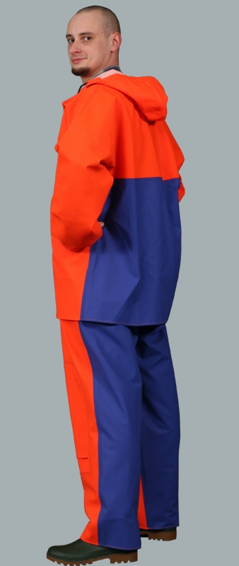 Sturmschutzanzug wasserdicht Modell 10044-005 wird aus dem Polyester Gewirk hergestellt mit Polyvinylchlorid beschichtet. Im Vorderteil aus dem Stoff von Grammatur 700 g/m², im Hinterteil wird aus dem Polyester Gewirk hergestellt mit Polyvinylchlorid beschichtet; die Grammatur 350 g/m². Der Anzug wurde so entworfen, damit auf eine günstige Weise den Menschen in den Situationen zu schützen, wenn das nötig ist. Vorderteil ist am meisten Durchwetzen, Zerreißen, mechanischen Beschädigungen ausgesetzt, deshalb wurde hier der Stoff mit höherer Grammatur benutzt. Das Produkt wird in schwieriger Fischerarbeit gebraucht und schützt erfolgreich vor dem Salzwasser. Der Anzug besteht aus der Wasserschutzschlupfjacke - Modell 1044 mit Windfängen ausgestattet, die dem Schutz bei der Arbeit mit hoch gehobenen Armen dient und der fest zugenähten Kapuze so entworfen, dass es möglich ist, darunter einen Schutzhelm zu tragen. Das Produkt beinhaltet auch eine Wasserschutzlatzhose Modell 005 mit Verstärkung an den Knien ausgestattet zu einem noch besseren Schutz des Arbeitsmannes. Das Produkt erfüllt die europäischen Normen: EN 340, EN 343.