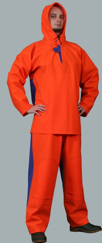 Sturmschutzanzug wasserdicht Modell 10044-005 wird aus dem Polyester Gewirk hergestellt mit Polyvinylchlorid beschichtet. Im Vorderteil aus dem Stoff von Grammatur 700 g/m², im Hinterteil wird aus dem Polyester Gewirk hergestellt mit Polyvinylchlorid beschichtet; die Grammatur 350 g/m². Der Anzug wurde so entworfen, damit auf eine günstige Weise den Menschen in den Situationen zu schützen, wenn das nötig ist. Vorderteil ist am meisten Durchwetzen, Zerreißen, mechanischen Beschädigungen ausgesetzt, deshalb wurde hier der Stoff mit höherer Grammatur benutzt. Das Produkt wird in schwieriger Fischerarbeit gebraucht und schützt erfolgreich vor dem Salzwasser. Der Anzug besteht aus der Wasserschutzschlupfjacke - Modell 1044 mit Windfängen ausgestattet, die dem Schutz bei der Arbeit mit hoch gehobenen Armen dient und der fest zugenähten Kapuze so entworfen, dass es möglich ist, darunter einen Schutzhelm zu tragen. Das Produkt beinhaltet auch eine Wasserschutzlatzhose Modell 005 mit Verstärkung an den Knien ausgestattet zu einem noch besseren Schutz des Arbeitsmannes. Das Produkt erfüllt die europäischen Normen: EN 340, EN 343.