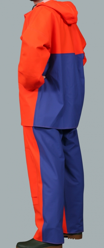 Sturmschutzanzug wasserdicht Modell 10044-005 wird aus dem Polyester Gewirk hergestellt mit Polyvinylchlorid beschichtet. Im Vorderteil aus dem Stoff von Grammatur 700 g/m², im Hinterteil wird aus dem Polyester Gewirk hergestellt mit Polyvinylchlorid beschichtet; die Grammatur 350 g/m². Der Anzug wurde so entworfen, damit auf eine günstige Weise den Menschen in den Situationen zu schützen, wenn das nötig ist. Vorderteil ist am meisten Durchwetzen, Zerreißen, mechanischen Beschädigungen ausgesetzt, deshalb wurde hier der Stoff mit höherer Grammatur benutzt. Das Produkt wird in schwieriger Fischerarbeit gebraucht und schützt erfolgreich vor dem Salzwasser. Der Anzug besteht aus der Wasserschutzschlupfjacke - Modell 1044 mit Windfängen ausgestattet, die dem Schutz bei der Arbeit mit hoch gehobenen Armen dient und der fest zugenähten Kapuze so entworfen, dass es möglich ist, darunter einen Schutzhelm zu tragen. Das Produkt beinhaltet auch eine Wasserschutzlatzhose Modell 005 mit Verstärkung an den Knien ausgestattet zu einem noch besseren Schutz des Arbeitsmannes. Das Produkt erfüllt die europäischen Normen: EN 340, EN 343.