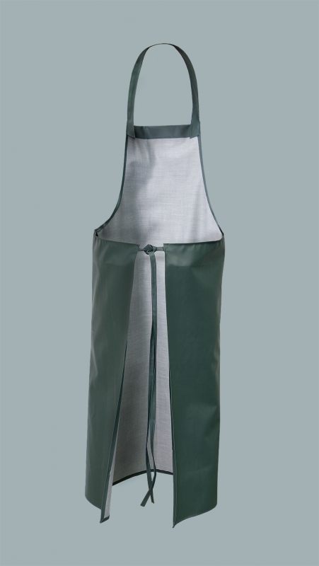 Schürze aus Baumwollgewebe, beschichtet mit Polyvinylchlorid. Die Schürze ist gegen Öl und ölhaltige Produkte jeder Art beständig. Das Produkt schützt auch vor Wasser, wodurch es bei Arbeiten unter starker Wassereinwirkung eingesetzt werden kann.