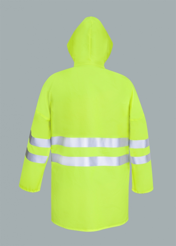 Sie wird aus dem aus dem Polyester Gewirk hergestellt mit Polyvinylchlorid beschichtet. Das Produkt wird überall dort benutzt, wo die Arbeit in schweren Bedingungen und bei schlechten Witterungsverhältnissen und in schlechter Sichtbarkeit ausgeübt wird. Dank des beidseitigen Verschweißens der Nähte mit Hochfrequenzstrom schützt das Produkt vor dem starken Wind und Regen. Bei dieser Jacke wurde die Kapuze entworfen, die man am Gesicht zuziehen kann; die Taschen werden eingelassen, damit das Wasser nicht innen kommt.