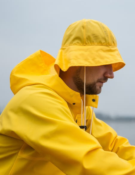 Hergestellt aus Polyestergewirk mit PVC-Beschichtung. Der Hut wird hauptsächlich bei Arbeiten in der Fischerei unter ungünstigen Witterungsbedingungen sowie überall dort eingesetzt, wo der Kopf starken Regenniederschlägen ausgesetzt ist. Das Produkt wird meistens in Verbindung mit Sturm-/Ölkleidung verwendet.