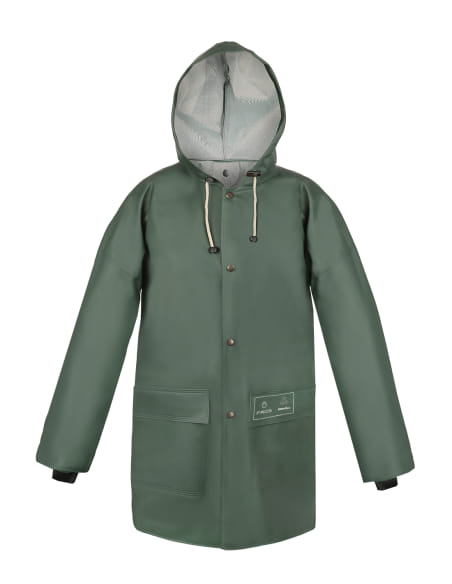 Der Mantel besteht aus der Technik des Doppelschweißens, die die Festigkeit der Nähte erhöht. Die Jacke wurde entwickelt, um die Beständigkeit gegen mechanische Beschädigungen zu erhöhen. Es hat zusätzliche Windmanschetten und Falten unter der vorderen Öffnung.