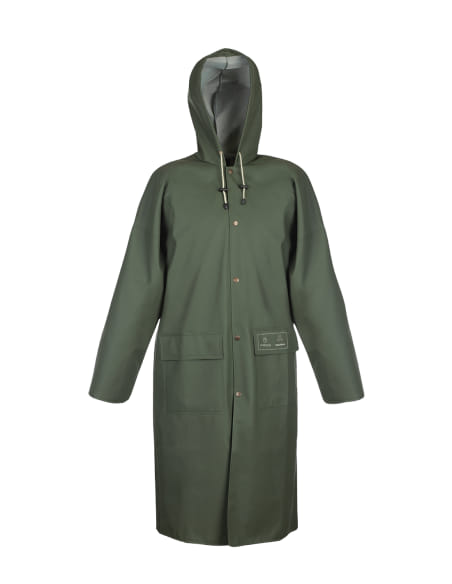 Hergestellt aus Polyestergewirk mit PVC-Beschichtung. Das Produkt wird bei Arbeiten unter schwierigen und ungünstigen Witterungsbedingungen eingesetzt. Der Mantel ist mit fester Kapuze mit Weitenregulierung im Gesichtsbereich und eingelassenen Taschen ausgestattet. Beidseitig hochfrequenzverschweißte Nähte bieten Schutz vor starkem Wind und Regen.