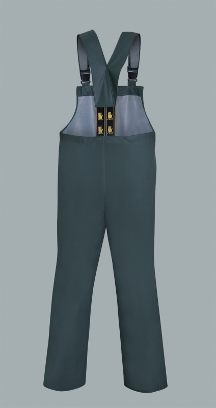 Hergestellt aus dem Polyester Gewirk mit Polyvinylchlorid beschichtet. Das Produkt wird überall dort benutzt, wo in schweren und ungünstigen Wetterbedingungen gearbeitet wird. Die Hose besitzt Hosenträger mit regulierbarer Länge, einer Schnalle und Gummiband.