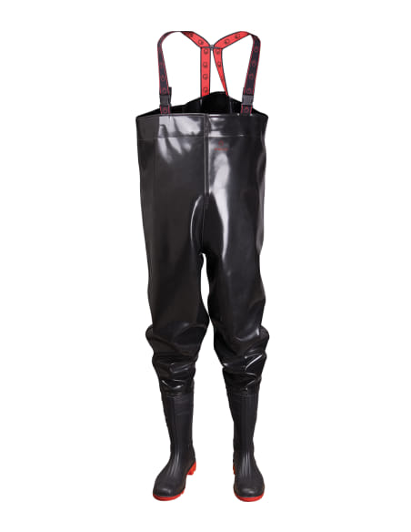 Wasserdichte Hose mit hoher Beständigkeit gegen mechanische Beschädigungen, mit fest verschweißten rutschfesten Stiefeln. Hergestellt aus sehr widerstandsfähigem Kunststoff, wartungsfrei. Die obere Schicht reduziert das Risiko von Schnitten und Durchstichen. Gummiband zum Anpassen der Größe an den Brustumfang. Die doppelseitige Versiegelungstechnik erhöht die Nahtfestigkeit. Innentasche zur einfachen Aufbewahrung von Dokumenten.