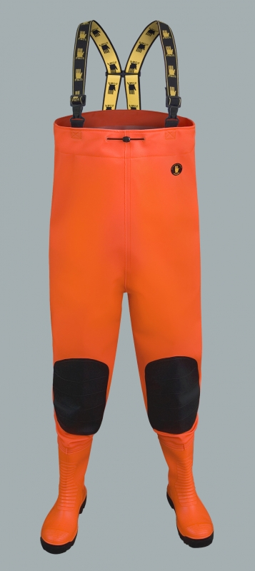 Die Wat-Hose "MAX S5" SBM01 FLUO ist aus Plavitex Heavy Duty Fluo Stoff (PVC / Polyester) mit einem Gewicht von 700 g / m² gefertigt, der sich mit sehr hohen Festigkeitswerten, erhöhter Sichtbarkeit durch die Verwendung eines speziellen Fluo Gewebes auszeichnet. Das Gewebe schützt den Arbeiter bei schwierigen Sichtbarkeitsbedingungen. Das entsprechende Gewicht des Produkts verleiht Schutz gegen mechanische Beschädigungen. Zusätzliche Verstärkung an den Knien schützen das Produkt gegen Abrieb und eventuellen Beschädigungen. Bei der Wat-Hosenherstellung wurden neue Befestigungen des Bandes und Trägergummi verwendet um den Komfort beim Gebrauch zu verbessern. Ergonomische hochklassige Schuhe (Typ S5) sind mit einem vor Durchlöcherung schützenden Fußbett und Stahlkappen, die zur Herstellung von WAT-HOSEN "MAX S5" verwendet werden, ausgestattet. Das alles stellt sie an erster Stelle in Härtetests und garantiert maximalen Schutz für die Füße und den ganzen Körper.