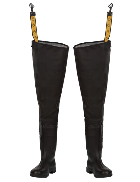 Specific features: - antistatic properties - increased strength of seams - elastic fixing tapes - high quality wellingtons - resistance to bending in low temperatures Norms: EN ISO 13688 EN 343 EN 1149-5 EN ISO 20347 - O4 FO SRC Description Waterproof trousers with permanently welded, high quality boots. Made of durable coated material with anti-electrostatic properties. Welding technique on both sides increases the strength of seams. The product is resistant to bending in high negative temperatures. Equipped with special elastic straps for belt attachment. Material PLAVITEX HEAVY DUTY ANTISTATIC - a polyester-based material coated on one side with PVC. It is highly resistant to tearing and has waterproof stitching. Due to the unique chemical composition of the coating the material has antistatic properties and can withstand adverse weather conditions and bending at temperatures down to -50°C. The material meets the requirements of the EN 343 and EN 1149-5 standards, which has been verified by tests conducted by a certified textile testing institute.