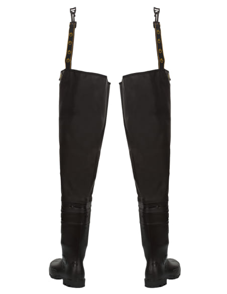 Specific features: - antistatic properties - increased strength of seams - elastic fixing tapes - high quality wellingtons - resistance to bending in low temperatures Norms: EN ISO 13688 EN 343 EN 1149-5 EN ISO 20347 - O4 FO SRC Description Waterproof trousers with permanently welded, high quality boots. Made of durable coated material with anti-electrostatic properties. Welding technique on both sides increases the strength of seams. The product is resistant to bending in high negative temperatures. Equipped with special elastic straps for belt attachment. Material PLAVITEX HEAVY DUTY ANTISTATIC - a polyester-based material coated on one side with PVC. It is highly resistant to tearing and has waterproof stitching. Due to the unique chemical composition of the coating the material has antistatic properties and can withstand adverse weather conditions and bending at temperatures down to -50°C. The material meets the requirements of the EN 343 and EN 1149-5 standards, which has been verified by tests conducted by a certified textile testing institute.