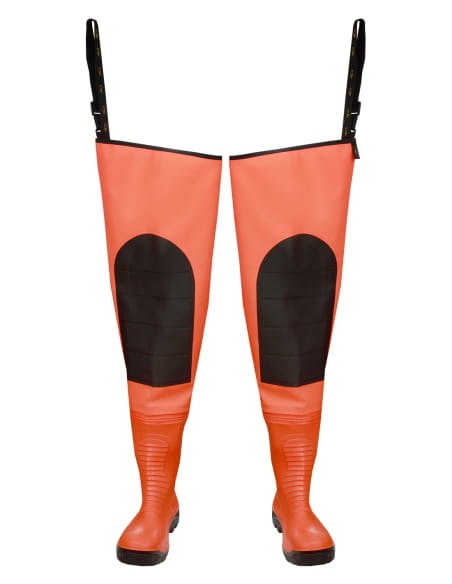Specific features: - increased strength of seams - reinforcements on knees - support fastenings - insole preventing puncture of the sole - fluo material for better visibility Norms: EN ISO 13688 EN 343 EN ISO 20345 - S5 SRC Description Thigh waders with high quality boots, permanently welded in. Effective protection against water. Technique of welding on both sides increases durability of seams. Functionality is increased by special reinforcements on knees, an insert preventing punctures on the underside of the wellingtons and a special toe cap protecting toes from injuries. Fluo material improves visibility in difficult conditions. The waders are equipped with comfortable support attachments for the waistband of the trousers. Material PLAVITEX HEAVY DUTY - a polyester-based material coated on one side with PVC. It is highly resistant to tearing and has waterproof stitching. Due to the unique chemical composition of the coating the material is extremely resistant to adverse weather conditions and bending at temperatures down to -50°C. The material meets the requirements of the EN 343 standard, which has been verified by tests conducted by a certified textile testing institute.