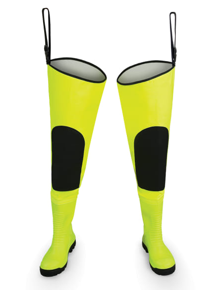 Specific features: - increased strength of seams - reinforcements on knees - support fastenings - insole preventing puncture of the sole - fluo material for better visibility Norms: EN ISO 13688 EN 343 EN ISO 20345 - S5 SRC Description Thigh waders with high quality boots, permanently welded in. Effective protection against water. Technique of welding on both sides increases durability of seams. Functionality is increased by special reinforcements on knees, an insert preventing punctures on the underside of the wellingtons and a special toe cap protecting toes from injuries. Fluo material improves visibility in difficult conditions. The waders are equipped with comfortable support attachments for the waistband of the trousers. Material PLAVITEX HEAVY DUTY - a polyester-based material coated on one side with PVC. It is highly resistant to tearing and has waterproof stitching. Due to the unique chemical composition of the coating the material is extremely resistant to adverse weather conditions and bending at temperatures down to -50°C. The material meets the requirements of the EN 343 standard, which has been verified by tests conducted by a certified textile testing institute.